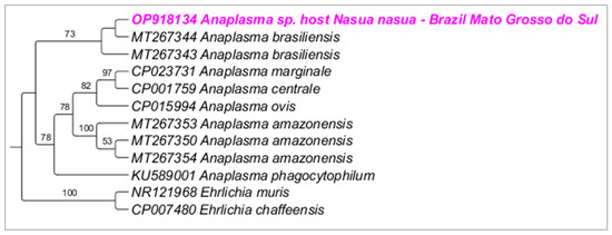 The Anaplasmataceae family (Order Rickettsiales) encompasses obligate intracellular α-proteobacteria that can cause important diseases in humans and animals [1,2]. Wild and domestic carnivores are considered an important source of tick-borne agents, especially in anthropized areas, where close contact between domestic/wild animals and humans can occur. Procyonidae mammals, including ring-tailed coatis Nasua nasua from Brazil, can easily adapt to peri-urban areas [3,4], favoring the exchange of ectoparasites and vector-borne pathogens among humans and animals. In the United States, raccoons (Procyon lotor) are incriminated as important reservoirs of Anaplasma phagocytophilum, a zoonotic agent transmitted by ticks from Ixodes persulcatus complex [1,5,6,7]. More recently, an unusual case of human anaplasmosis was reported in the Amazon, French Guiana, caused by ‘Candidatus Anaplasma sparouinense’, a putative novel Anaplasma sp. closely related to Anaplasma genotypes previously detected in Amblyomma coelebs ticks collected from coatis, rats, and sloths (‘Candidatus Anaplasma amazonensis’) [2].