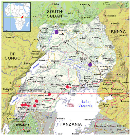 - Vudriko, P.; Okwee-Acai, J.; Byaruhanga, J.; Tayebwa, D.S.; Okech, S.G.; Tweyongyere, R.; Wampande, E.M.; Okurut, A.R.A.; Mugabi, K.; Muhindo, J.B.; et al. Chemical tick control practices in southwestern and northwestern Uganda. Ticks Tick-Borne Dis. 2018, 9, 945–955. [Google Scholar] [CrossRef]