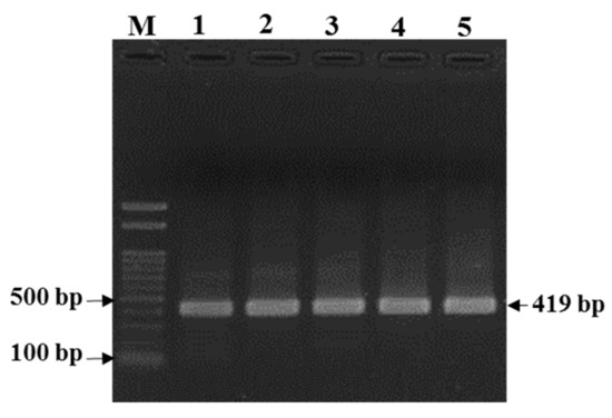PCR amplification of Rhipicephalus (Boophilus) decoloratus partial octopamine/tyramine receptor gene. Lane M, 100 bp marker; Lane 1, R. (B.) microplus Thailand strain (control DNA); Lanes 2–5, R. (B.) decoloratus DNA samples from different farms/populations from Uganda: 2, 1SHM; 3, 2BUS; 4, WKB; 5, 2MTM.