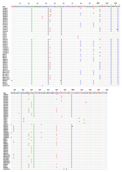 Multiple sequence analysis of 231 bp R. (B.) decoloratus OCT/Tyr receptor gene partial coding region in amitraz-resistant and -susceptible ticks. AJ010743, octopamine-like, G-protein coupled receptor from R. (B.) microplus strain from Australia. A total of 47 sequences were generated in this study. Amitraz resistance was associated with SNPs at loci A1G, C46T A122G and T215C. AM9 to KMGRC2 identifies different clones of the OCT/Tyr gene from various tick populations studied.