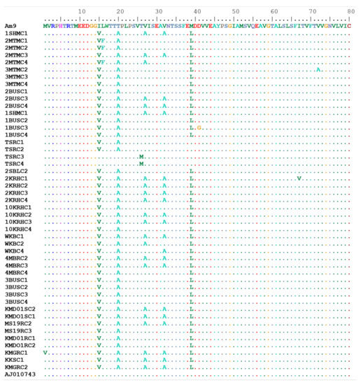 Multiple sequence alignment of deduced amino acid sequence for R. (B.) decoloratus OCT/Tyr receptor gene partial coding region in amitraz-resistant and -susceptible ticks. OCT/Tyr sequence from GenBank: AJ010743.1 (octopamine-like, G-protein coupled receptor from R. (B.) microplus strain from Australia). Amitraz resistance was associated with M1V, F16F, D41G and V72A amino acid substitutions. AM9 to KMGRC2 identifies different clones of the OCT/Tyr gene from various tick populations studied.