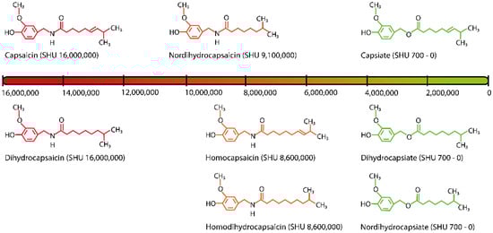 The Capsicum genus consists of up to 42 species of pepper, where C. annuum, C. baccatum, C. frutescens, C. chinense, and C. pubescens are the most commonly produced. Overall, Capsicum peppers are divided into two groups, pungent and non-pungent, also called hot and sweet peppers [20]. The pungency of Capsicum cultivars is closely related to the concentration of capsaicinoid molecules present in the pepper fruit [21]. The pungency index of peppers has been expressed in Scoville Heat Units (SHUs), which represent the number of dilutions in water required for a sample to lose its pungency sensation [22].