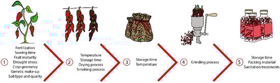 The biosynthesis and accumulation of Capsaicinoids and capsinoids can be affected by Capsicum genotype, agronomic parameters (soil type and quality, sowing time, fertilization, fruit maturity, crop geometry), environmental factors (temperature, drought stresses), and postharvest processing (drying and/or smoking processes, storage conditions, sanitation treatments, and packing) (Figure 2) [61,62,63,64].