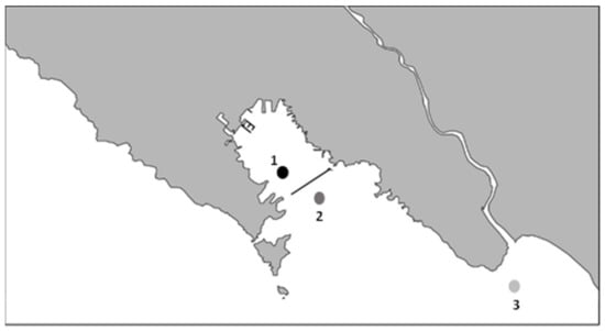 Schematic map of sampling sites: (1) Main production area, (2) relaying site 2, (3) relaying site 3. The approximate distance from (1) to (2) is 0.94 Km, and (1) to (3) is 11.5 Km.