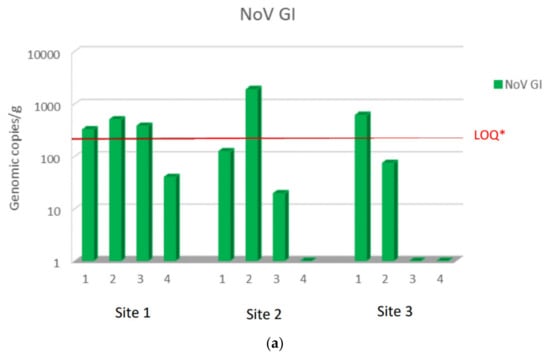 NoV RNA levels detected in oysters at Time 0 of the relay (T0) at site 1, site 2, and site 3: (a) NoV GI; (b) NoVGII. Values are expressed in genome copies/gram. * LOQ: 140 g.c./g for NoV GI and 130 g.c./g for NoV GII.