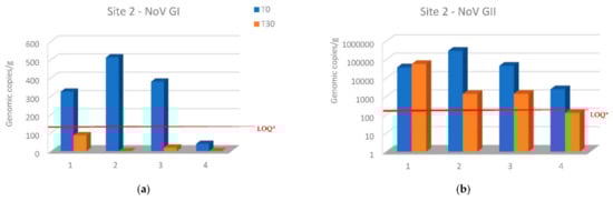 NoV GI levels decreased in all samples below the LOQ of the assay (140 genomic copies per g) at site 2 after 30 days from the transfer of oysters from site 1. Moreover, NoV GI was not detected in two samples after relaying period (Figure 3a). In the same site, NoV GII levels decreased in all oyster samples except in the first sampling, while NoV GII levels decreased below the LOQ (130 genomic copies per g) in the last sampling (Figure 3b).