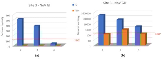 Comparison of NoV RNA levels in oysters at Time 0 of the relay (T0) and after 30 days of the relay (T30) at site 3: (a) NoV GI; (b) NoV GII. Values are expressed in genome copies/gram. * LOQ: 140 g.c./g for NoV GI and 130 g.c./g for NoV GII.