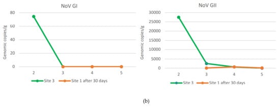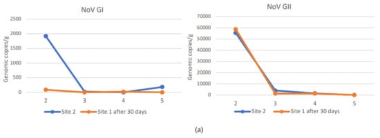 During the study period from November to February, NoV GI and NoV GII were always detected at harvest site 1 in a concentration higher than sites 2 and 3, except for NoV GI in December month (second sampling), when it was present at higher concentration at site 2. NoV GII was found at all sites at higher concentrations than NoV GI. The maximum NoV GII load was 3.1 × 105 viral g.c./g at site 1, 5.5 × 104 viral g.c./g at site 2, and 2.7 × 104 viral g.c./g at site 3. The maximum load of NoV GI was 5.1 × 102 viral g.c./g at site 1, 1.9 × 103 viral g.c./g at site 2, and 6.2 × 103 viral g.c./g at site 3. Moreover, NoV GII was always detected in all sampling, while NoV GI was absent or below the LOQ in some samples at sites 2 and 3. Among the sites used for relaying, site 3 was the one with a lower concentration of both NoV GI and NoV GII compared to site 2 (Figure 2a,b).