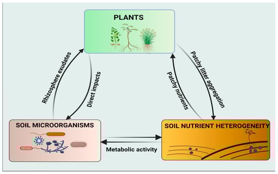 Schematic representation of the interactions between the plant, soil microorganisms, and soil nutrient heterogeneity. Both plants and soil microorganisms can acquire their nutrients from patchy microsites and alter soil properties by organic litter decomposition and metabolic activities, respectively. Soil microorganisms have diverse, direct effects on plants, e.g., mineralization of organic matter and homogenization of patchy nutrients. Plants interact with soil microorganisms through metabolites exuded by the roots, particularly in the rhizospheric zone.