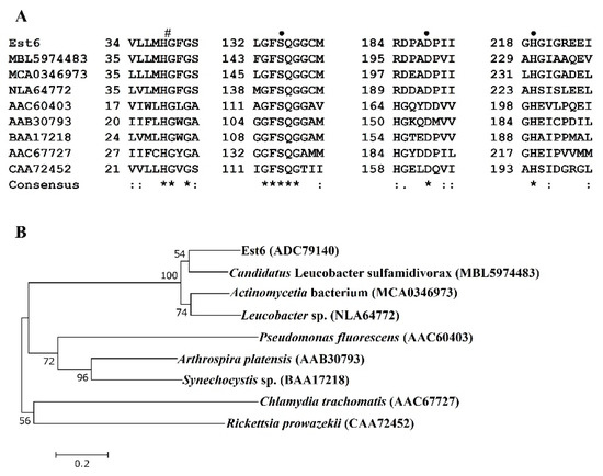 (A) Multiple alignments of Est6 and other related proteins: MBL5974483, hypothetical protein D3X82_12175 from Candidatus Leucobacter sulfamidivorax; MCA0346973, phospholipase from Actinobacteria bacterium; NLA64772, prolyl oligopeptidase family serine peptidase from Leucobacter sp.; the following five proteins belonged to family VI bacterial lipolytic enzymes [Arpigny and Jaegar, 1999]: AAC60403, esterase II from Pseudomonas fluorescens; AAB30793, serine esterase from Arthrospira platensis; BAA17218, serine esterase from Synechocystis sp. PCC 6803; AAC67727, predicted lysophospholipase esterase from Chlamydia trachomatis D/UW-3/CX; CAA72452, esterase from Rickettsia prowazekii. The catalytic triad is indicated as “•” above the sequence, and the oxyanion hole site HG is labeled as “#” above the sequence. All residues are identical (*), there are conserved substitutions (:) and there are semi-conserved substitutions (.) in that column in the alignment. (B) Neighbor-joining phylogenetic tree of Est6 and closely related proteins. The analysis was performed using the programs Clustal X 2.0 and MEGA 7.0. The percentage shown from each branch is from the 1000 bootstrap resamplings. Only the bootstrap values higher than 50% were shown. The scale bar represents 0.2 changes per amino acid.
