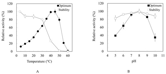 The purified Est6 was active in the broad range of pH 5.0 to pH 10.0, with maximal activity at pH 8.0 (Figure 3A). The enzyme maintained more than 80% relative activity in the pH range of 5.0 to 10.0 after preincubation at 4 °C for 24 h (Figure 3A). Est6 displayed the highest activity at 45 °C, with activity rapidly decreasing at temperatures above 55 °C. Between the temperatures of 25 °C to 50 °C, more than 50% of the maximal activity that was observed at 45 °C remained (Figure 3B). Thermostability analysis by preincubation at various temperatures for 1 h revealed that Est6 was unstable at 40 °C and rapidly inactivated at 60 °C (Figure 3B).