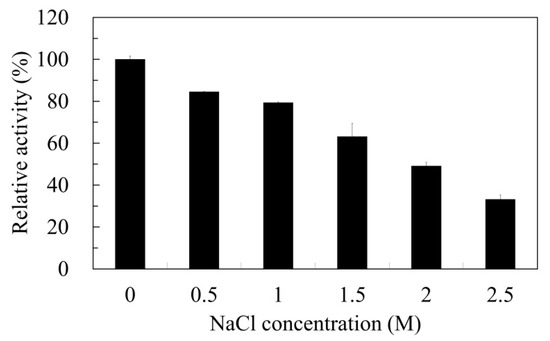 The stability of Est6 in various organic solvents was determined (Table 2). Est6 activity was stable in 10% methanol, 10% ethanol, 10% isopropanol, or 10% DMSO, with approximately 70% residual activity compared with that of a non-organic solvent condition. Est6 showed very low activity (0.3%) when incubated in 10% Butanol. The activity of Est6 was severely inhibited by Cu2+, Ni2+, or Co2+ ions; however, the activity maintained the same levels in the presence of Mg2+, Ca2+, or Mn2+, while EDTA slightly activated the enzyme (Table 3). The effect of PMSF, a serine modifier, on the activity of Est6 was determined. The result indicated that at 1 mM PMSF, the catalytic serine residue of Est6 was modified and its activity was lost (Table 3). In the presence of 1% SDS, the remaining activity of Est6 was barely detected, while the enzyme maintained more than 60% of its relative activity in the presence of 1% Tween 20, Tween 40, Tween 60, Tween 80, and Triton X-100 at 30 °C for 30 min, respectively, compared with that of a non-detergent condition (Table 3). In addition, the stability of Est6 activity was examined after incubation in various concentrations of NaCl at 30 °C for 30 min. The relative activity of Est6 decreased with increasing NaCl concentration and remained at approximately 50% at the 2 M NaCl concentration compared with that of a no-NaCl condition (Figure 4).