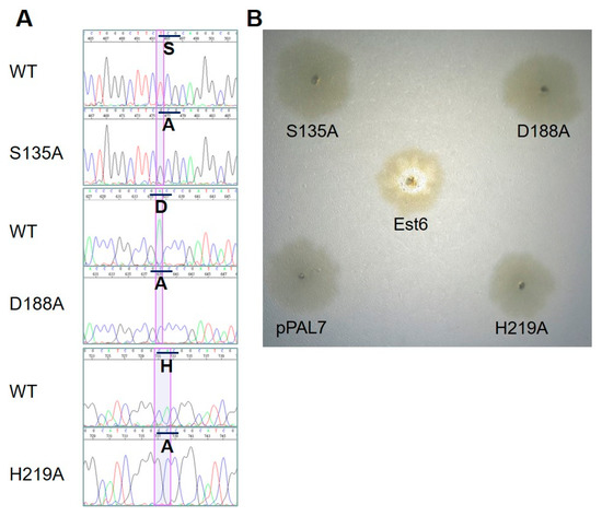 Each residue of the putative catalytic triad of Est6 was mutated to Ala successfully by an overlap extension PCR and confirmed by DNA sequencing (Figure 5A). Evaluating the lipolytic activity of each mutant was monitored on the Spirit Blue Agar plate. After two days of incubation at 35 °C and one day in the refrigerator, all mutants had no lipolytic activity by checking clear halos around or in the colonies compared with wild-type Est6 (Figure 5B).