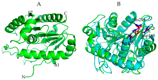 3D structural modeling of Est6. (A) The rank 1 model of Est6 with eight α-helices and seven β-sheets predicted by AlphaFold2. (B) Superposition of the rank 1 model predicted by AlphaFold2 (in green) with the rank 1 model predicted by I-TASSER (in cyan). The putative catalytic triad, including Ser135, Asp188, and His219, are shown in red stick forms predicted by AlphaFold2 and in blue stick forms predicted by I-TASSER, respectively. PyMOL2 software was used to visualize and superpose the predicted 3D structural models.