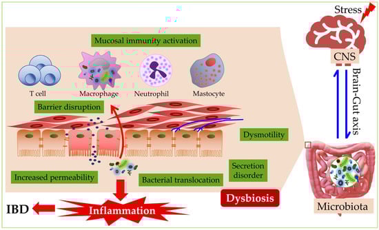 The influence of stress on inflammatory bowel disease. Stress promotes the activation of the brain–gut axis, contributing to the development of inflammatory bowel disease (IBD) through dysbiosis, changes in secretion and mobility, disturbance of the intestinal barrier, and the release of inflammatory mediators. CNS—central nervous system.
