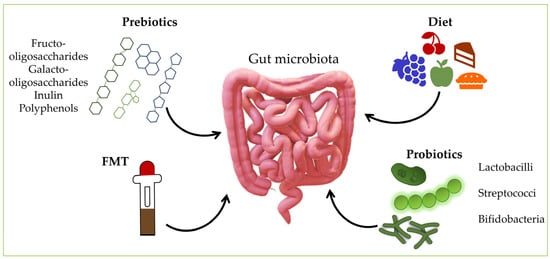 The intestinal microbiota is an essential component of who we are, and the mutual dialogue between the microbiota and the host results in lifelong epigenetic programming [133]. The significance of the intestinal microflora in preserving the organism’s normal functioning has become increasingly acknowledged in recent years. As a result, numerous studies have investigated the potential therapeutic effects of microorganisms found in the intestinal microbiome in a myriad of diseases [134]. In most cases, it is unclear whether changes in the microbiota are a cause or consequence of the disease and whether the manipulation of the gut microbiota can help control or even treat the pathological condition [133]. Some lifestyle changes via alternative treatments, including fecal microbiota transplantation (FMT), diet changes, and dietary supplementation with probiotics, prebiotics, and symbiotics, have indicated possible protective effects in microbiota dysbiosis and promotion of healthy microbes, along with minimal long-term unfavorable effects [135] (Figure 2). Nevertheless, existing microbial-targeted treatments, including probiotics, prebiotics, FMT, and specific dietary regimens, yield mixed results that could be more optimal for everyday clinical use [136,137,138].