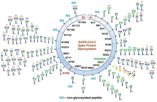 Glycosylation profile on coronavirus SARS-CoV-2 characterized by high-resolution LC-MS/MS. About 17 N-glycosylation sites were found occupied out of 22 potential sites along with two O-glycosylation sites bearing core-1 type O-glycans. Some N-glycosylation sites were partially glycosylated. Monosaccharide symbols follow the Symbol Nomenclature for Glycans (SNFG) system). This figure was reprinted and adapted permission from with the 2015 paper by Vari et al. [].