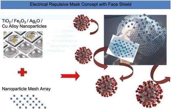 Metal oxides like titanium, zinc and iron oxides and copper nanoparticles are often used in nanoparticle work []. The antimicrobial and antiviral nanoparticles are likely to be as effective as silver or gold or their alloys. Silver and gold have long been known for their antiviral and antimicrobial properties and had been used in medical devices to combat antigens. Surface plasmons based on silver and gold nanoparticles resulted in increased efficacy in combatting and neutralizing many types of microorganisms []. This study focused on the design of silver/gold impregnated COVID mask layers to be used as a face shield to prevent COVID infection and reinfections. In the case where plasmonic effects are not strong enough to neutralize antigens by silver or gold plasmonic layered face masks, wearable electronic devices such as mobile phones or compact portable battery sources are used to induce higher electrostatic effects with high efficiencies. While silver/gold nanostructure can be used as a disinfectant, even coated on fabrics, and included in sprays, they are not primary used in this way. However, face masks impregnated with antimicrobial nanoparticles are proven to provide additional protection against microorganisms and viruses. This reduction in the probability of the transmission and infection is significant; a thorough clinical investigation should follow to quantify and optimize their efficacies for these purposes [].