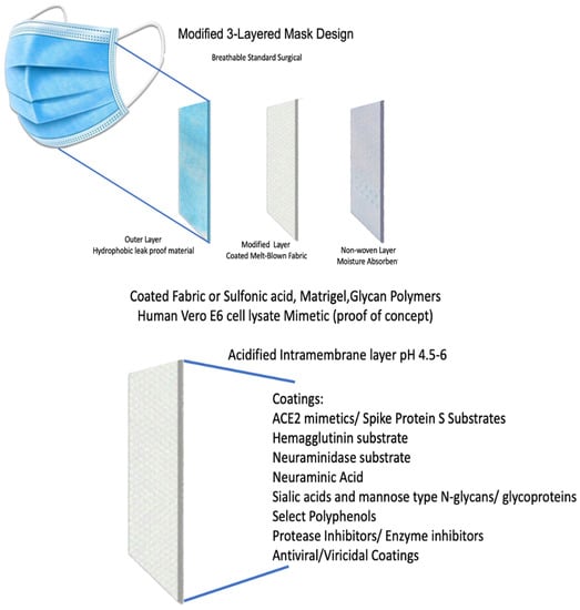 Coatings are diverse but center around a few key concepts, namely binding or trapping agents to fix and secure virions and virucidal substrate to kill any incident particle or pathogen. For example, HA or the S-protein interact and locks in a configuration on a non-cellular surface that would prevent fusion of the cellular and viral membranes in vitro. In effect this is a trap and a cellular decoy. Below is an example list of targets to achieve this goal by type and include N-Acetylneuraminic acid (Neu5Ac), NA inhibitors like Oseltamivir, O-GlucNAcase inhibitors like Thiamet G and sugar analogues like disaccharide or polysaccharide decoys bound on a matrix scaffold to mask material. Utilizing viral binding moieties to trap coronavirus, we turned to sugars, glycans carbohydrate polymers and matrigels, which are the first innocuous and effective coating to consider, and evidence suggests N-acetylated (GlcNAc)/N-sulfated glucosamine (GlcNS) and glucuronic acid (GlcA) are a able to capture viral spike proteins []. Further, possible inexpensive version of our mask concept may lie with sugar linked polymers of seaweed, which is an inexpensive and abundant renewable source of these glycans. This renewable abundant natural plant-based approach holds promise for many or humanity’s needs. This is a negatively charged matrix, which was shown to worked on viruses. Since NA/Neu5Ac is the predominant sialic acid found on human and many mammalian cells, choosing these as target decoys for PPE coatings make tremendous sense from safety and efficacy standpoints. Other forms of sialic acid-type decoys include N-Glycolylneuraminic acid, which also occur on cells and could be useful surrogate targets for cornoviridiae or for binding approaches across the viral pathogen spectrum. These residues are negatively charged at physiological pH and are found in complex glycans and in chains on mucins and glycoproteins at the cell membranes and give these fluids a slippery feel. In fact, N-Glycolylneuraminic acid, a particular sialic acid, is known to act as a decoy for invading pathogens. Along with involvement in preventing infections, Neu5Ac acts as a receptor for influenza and other viruses, allowing attachment to mucous cells via hemagglutinin an early step in acquiring viral infection. Moreover, sugars and glycans from renewable and sustainable sources like seaweed are extremely viable options for new mask constructs.