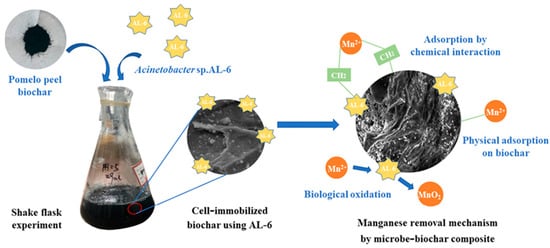 - An, Q.; Zhang, C.Y.; Zhao, B.; Li, Z.; Deng, S.M.; Wang, T.; Jin, L. Insight into synergies between Acinetobacter sp. AL-6 and pomelo peel biochar in a hybrid process for highly efficient Mn removal. Sci. Total Environ. 2021, 793, 8. [Google Scholar] [CrossRef] [PubMed]
