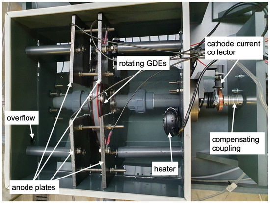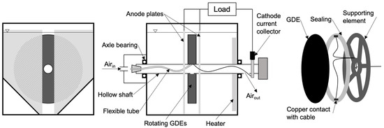 All experiments were carried out with a reactor with its rotating cathode as centerpiece. For each reactor, two cathodes were mounted to a PVC supporting element. This element was glued onto a hollow shaft with an outer diameter of 32 mm (also PVC). Two holes (opposite) were drilled from the supporting element to the hollow shaft. A flexible tube was glued to one hole going to one end of the hollow shaft, ending in a plug with another hole. This was necessary to pump air through the hollow shaft directly into the supporting element to provide enough air for the GDEs. The second hole in the hollow shaft functions both as an air outlet and for the cable gland. A common copper cable was used to connect the GDEs. Therefore, the cable was soldered to a thin copper foil. When mounting the GDEs to the supporting element, the GDEs were pressed right onto the copper foil by screwing an annular fixing element. A sealing with the same shape as the annular fixing element was placed between GDEs and supporting element.