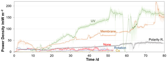 Development of power densities over time within 80 days for the anti-fouling strategies UV-irradiation, membrane addition, polarity reversal, rotation speed and copper layer addition compared to untreated GDE.