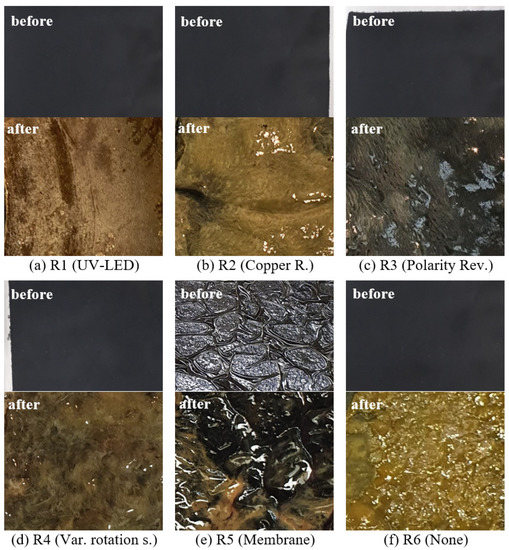 Accordingly, the use of the antibacterial membrane and the UV irradiation seems to reduce the biofilm infestation. This can be confirmed by the photos of the removed cathodes. The irradiated electrode does not show any biofilm on its surface. Only scaling effects can be seen (Figure 5a). The GDE coated with a membrane shows slight biofilm growth but the black surface of the electrode can still predominantly be seen (Figure 5e). In addition, the biofilm does not appear to be cross-linked to the membrane, allowing an easy removement.