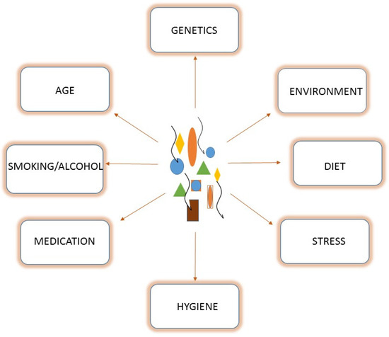 Trillions of different microorganisms, bacteria, archaea, phages, and protozoa compose the gut microbiota. It represents a solid organ, weighing approximately 2 kg, and able to direct host metabolic and immunity pathways [1]. Specifically, the gastrointestinal tract harbors approximately 1013–1014 bacterial cells [2]. The most represented phyla are Firmicutes, Bacteroidetes, and Proteobacteria, while Actinobacteria contribute less to the total bacterial composition [1,3]. The Firmicutes phylum is composed of more than 200 genera, of which Clostridioides is the most represented (95%). On the other hand, in the Bacteroidetes phylum, Prevotella and Bacteroides, are the predominant genera, while the Bifidobacterium genus represents the major member in the Actinobacteria phylum [4]. Bacterial species are variably distributed throughout the gastrointestinal tract. Streptococcus, Prevotella, Actinomyces, Gemella, Rothia, Granulicatella, Haemophilus, and Veillonella are the predominant genera in the throat and distal esophagus [5]. In the stomach, microbial diversity depends upon the presence and absence of Helicobacter pylori [6,7]. Stomachs lacking H. pylori are mainly populated by Streptococcus spp., Actinomyces spp., Prevotella spp., and Gemella spp., which are predominantly found in the throat, indicating that they may be transient residents originating there [5]. The recto-sigmoid colon microbiota is more complex than the jejunum, ileum, and caecum resident microbes. Enterococcus spp., Escherichia coli, Klebsiella spp, Lactobacillus spp., Staphylococcus spp., and Streptococcus spp. are present in the jejunum and ileum. Most microbes of the jejunum and ileum are aerobes and facultative anaerobes [8]. The small intestine harbors the aerobic Enterococcus group, Lactobacillus spp., Streptococcus spp., and Gammaproteobacteria, whereas anaerobes are predominant in the large intestine. Cecal microbiota are more complex than jejunal and ileal microbiota. The cecal bacteria are predominated by Lactobacillus, Enterococcus, and E. coli [9]. In the recto-sigmoidal colon, strictly anaerobic bacteria belonging to Bacteroides spp., Clostridioides coccoides, and Clostridioides leptum are the predominant bacterial groups [8]. Given the complexity and multifactorial activities in terms of the evolution of the human intestinal microbiota, it is difficult to establish the composition of an ideal and healthy microbiota. Generally, a state of eubiosis is characterized by a strong presence of Firmicutes and Bacteroidetes and by a low percentage of Proteobacteria which, instead, increase during inflammatory states.