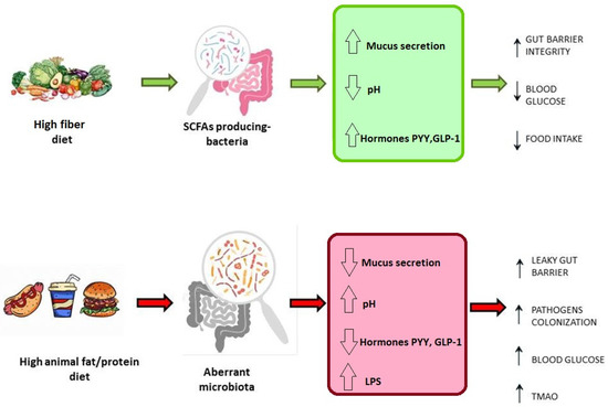 Geographical localization, culture, and genetic background represent crucial elements affecting the microbiota composition and modulation [17,22]. Nevertheless, in recent years, several studies have shown that diet is the main factor responsible for more than 50% of the variability in the microbiota, and that host genetics have a minor role in determining the microbiome composition [23]. Several population-based studies have reinforced this evidence. For example, Westernized and thus most urbanized populations are characterized by reduced microbial biodiversity, with a decline in particular genera, such as Treponema [3]. Conversely, non-Westernized rural populations, such as the Hazda community in Tanzania or the Hutterites in North America, whose diets derive from raw or wild foods, exhibit a high microbial diversity and abundance of certain genera, such as Prevotella [3,24]. Exploring the link between diet and gut microbial populations is fundamental to outlining the potential of dietary interventions to modulate the composition of the gut microbiota. In general, it is possible to assert that each macronutrient has a specific impact on the gut microbiota, affecting bacterial classes with particular metabolic functions [12,22]. Specifically, a high-fiber diet leads to a marked increase in species that produce short-chain fatty acids (SCFAs), such as Faecalibacterium prausnitzii, Roseburia, Eubacterium, and Blautia, which are involved in the fermentation of these fibers in the distal part of the colon. These species are beneficial for eubiosis, contributing to metabolic benefits [25]. Firstly, SCFAs are an important energy source for colonocytes and balancing factors in the intestinal microenvironment by regulating mucus production and lowering the pH in the lumen, resulting in an intact gut barrier and the inhibition of colonization. Furthermore, SCFAs interact with cellular receptors, such as GPCR-41/43 (G-protein-coupled receptors) expressed on L-cells, stimulating the production of PYY (peptide YY) and GLP-1 (glucagon-like peptide 1) hormones, resulting in increased insulin secretion and decreased blood sugar [3,26]. Butyrate is responsible for maintaining an anaerobic environment through the consumption of oxygen mediated by the PPARγ receptor (peroxisome proliferator-activated receptor-γ) [27]. Moreover, butyrate functions in the regulation of cellular proliferation, differentiation, and apoptosis. In particular, this metabolite shows contradictory anti-proliferative effects on differentiated and undifferentiated colonocytes, a phenomenon called the “Butyrate paradox”. In fact, if, in epithelial cells, the anti-proliferative signal represents a protective effect for colonic neoplasia, it has the opposite significance for intestinal stem cells, where anti-proliferative signals are involved in the crypt cells [18,28]. In contrast, a high-protein, high-fat, low-fiber diet, typical of urbanized populations, is associated with reduced biodiversity and an increase in potentially inflammatory species, such as Bacteroides [17,29,30]. Specifically, the microbiota of individuals consuming this type of diet is largely characterized by Gram-negative bacteria, and thus strongly induce inflammation via lipopolysaccharide (LPS). The consequent reduction in SCFAs leads to a drop in hormone production and, thus, to a leaky mucosa. Moreover, in this environment, gut bacteria produce trimethylamine (TMA) by metabolizing L-carnitine and phosphatidylcholine [31]. These molecules are ingested from red meat or energy drinks. TMA is then converted in the liver into trimethylamine N-oxide, which contributes to atherosclerosis, altering cholesterol metabolism [32,33].
