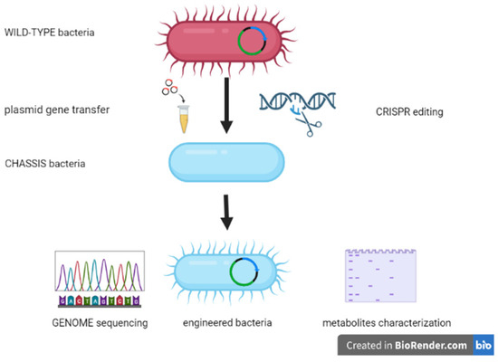 The use of engineered bacterial strains represents the most futuristic and encouraging approach to modulating the structure and function of the gut microbiota. Such strains can be designed to interact with other commensal bacteria, influence metabolic pathways through the production of biomolecules, and modulate local and systemic immune functions [107,108]. These complex interactions have a strong impact on the host health/disease balance. The first step in this methodological strategy is selecting chassis bacteria on which to carry out the engineering [109]. The choice of the strain involves various aspects, such as the microenvironment, in which the bacterium will have to express its biological properties, bio-distribution and elimination kinetics, routes of administration, and biosafety criteria [108] (Figure 3).