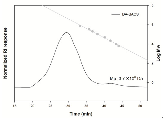 The molecular sizes of EPS from L. paracasei EPS DA-BACS by relative comparison with pullulan standards are shown in Figure 3. EPS from L. paracasei EPS DA-BACS showed widely distributed molecular size ranges, and the peak molecular weight (Mp) of glycan was around 3.7 × 106 Da according to the calibration curve. The broadly distributed molecular size of EPS from L. paracasei EPS DA-BACS is supported by previous research that glucomannan-type EPS from Lactiplantiobacillus plantarum BR2 showed a similar molecular distributed pattern (1.5–5.0 × 106 Da; Mp: 2.4 × 106 Da) [36].