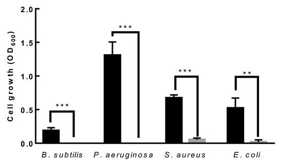 Antibacterial activity was evaluated as follows: The culture broth of L. paracasei EPS DA-BACS was inoculated into MRS broth and incubated at 37 °C for 24 h under anaerobic conditions. The culture broth was centrifuged at 1508× g for 10 min and the supernatant was filtered. The filtrate was diluted to 1/10th with Mueller Hinton II medium consisting of 17.5 g casein hydrolysate, 2.0 g beef infusion solids, and 1.5 g starch, per liter (Sigma-Aldrich, St. Louis, MO, USA), and 200 μL was dispensed into a 96-well plate. The indicator strains, P. aeruginosa, Bacillus subtilis, E. coli, and S. aureus were cultured in nutrient broth containing 3.0 g beef extract, and 5.0 g peptone, per liter (Becton, Dickinson and Company, Franklin Lakes, NJ, USA). The culture broth of the indicator strains was inoculated in a 96-well plate at a final concentration of 1% (v/v). The filtrate of the culture supernatant was used as the blank group, and the culture broth of indicator strains grown in MH medium was used as the control group. A 96-well plate was incubated at 37 °C for 24 h and cell growth was measured at 600 nm.