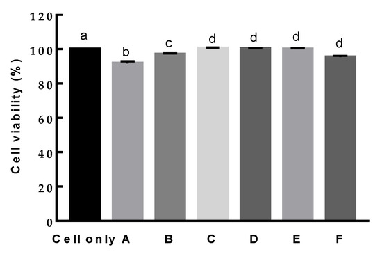 All experiments were carried out in triplicates, and the results were expressed as the mean ± standard deviation (SD). Statistical significance of the data was verified by one-way analysis of variance (ANOVA) using SPSS Statistics 25 (SPSS Inc., Chicago, IL, USA). Duncan’s test and Dunnett’s test were used to determine significant differences between multiple groups at p < 0.05.