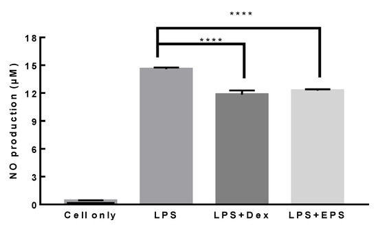 Anti-inflammatory activity assay was carried out as described previously with a slight modification [22]. RAW 264.7 cells were inoculated in a 6-well plate at 5 × 105 cells per well and incubated at 37 °C with 5% CO2 for 20 h. RAW 264.7 cells were treated with heat-killed L. paracasei EPS DA-BACS cells as described in Section 2.12. RAW 264.7 cells treated with 1 μg/mL LPS were used as a positive control. NO secretion was determined using the Griess Reagent System (G2930, Promega, Madison, WI, USA). Dexamethasone was added instead of LAB at a concentration of 1 µM as a positive control The cells were incubated for 2 h, followed by the addition of 1 μg/mL LPS and incubation at 37 °C for 24 h.