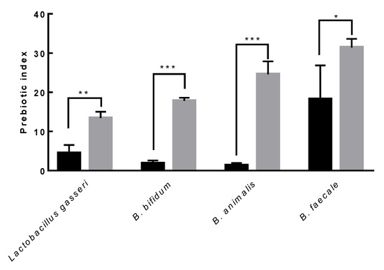 To analyze the prebiotic activity of purified EPS, 100 μL of basal MRS broth or TSB broth without glucose, supplemented with 2% (w/v) EPS, was loaded into a 96-well plate. Cultures of L. paracasei EPS DA-BACS, Lactobacillus gasseri, B. bifidum, B. animalis, and B. faecale were inoculated at a final concentration of 1% (v/v). C. difficile, E. coli, and Bacteroides fragilis were inoculated in TSB broth without glucose supplemented with 2% (w/v) EPS at a final concentration of 1% (v/v). For comparative experiments, the same experiment was carried out on MRS broth, TSB broth basal MRS broth, or TSB broth without glucose supplemented with 2% (w/v) inulin as representative prebiotics. The same experiment was carried out using MRS broth without glucose and TSB broth without glucose as a blank and MRS broth with 2%(w/v) glucose or TSB broth with 2% (w/v) glucose as a control. The prebiotic index was calculated using Equation (5) according to Hussein et al. [23].