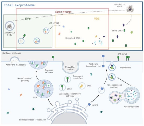 Schematic representation of the Leishmania spp. total exoproteome, secretome, extracellular vesicles (EVs), and vesicle depleted exoproteome (VDE) concepts. The exoproteome (blue rectangle) regroups all the secreted proteins as well as proteins that originated in the shedding of surface proteins or cell lysis; the secretome (pink rectangle) regroups all secreted proteins through conventional like the secreted acid phosphatases (SAPs) or non-classical pathways like the hydrophilic acylated surface protein B (HASPB); the EV fraction (green shaded rectangle) contains all vesicular components of the exoproteome, including those that originate from secretion, like the exosomes that are accumulated and released from the multivesicular bodies (MVBs) or from cellular lysis (dotted arrows); and the VDE (yellow shaded rectangle) contains all the non-vesicular components of the VDE, including those that originate from secretion, shedding from the surface, or lysis of cells or EVs (dotted arrows). The figure was created with BioRender.com.