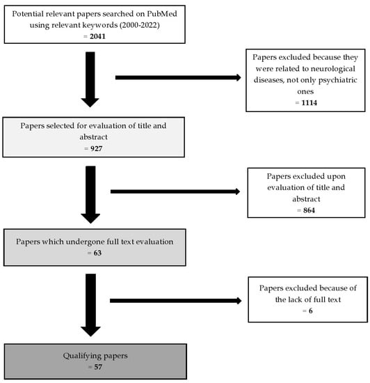 The methods of this review article were based on the use of the PubMed database to search for all related published studies. The selection was based on the keywords “gut microbiome”, “gut–brain axis”, “psychiatric disorders”, “depression”, “anxiety”, “autism”, “schizophrenia”, “probiotics” and “postbiotics”. We found 2041 articles and, after the exclusion process, 57 qualifying studies remained. The inclusion criteria were: (1) the year of publication (2000–2022); (2) the relevance of the title and of the abstract; (3) the availability of the full-text article. The exclusion criteria were: (1) studies also related to neurological diseases not only psychiatric ones; (2) title and abstract irrelevant to the aim of our study (Figure 1).