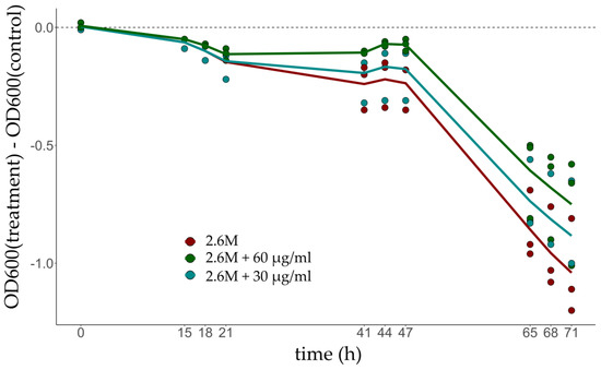 Glycerol’s role in expanding the water activity limit for microbial cell function has been recently discussed in fungi [39] although not so much is known in archaea. It is known that the habitat of H. salinarum is also home to the algae Dunaliella salina which produces glycerol, a compatible solute, to deal with the osmotic imbalance that occurs due to variations in environmental conditions [40,41]. The co-culture of the two microorganisms showed that D. salina secretes substances and nutrients important for the survival of H. salinarum [40]. We hypothesized that the up-regulation of genes encoding glycerol-3 phosphate dehydrogenase (glpA, glpB, and glpC) could be related to the availability of glycerol secreted by D. salina, allowing an increase in O.D. of cultures under these conditions when supplemented with glycerol. Glycerol metabolism was evaluated by performing growth curves at 2.6 M and 4.3 M NaCl with the addition of glycerol at concentrations compatible with those secreted by D. salina: mean of 30 µg/mL and a maximum of 60 µg/mL [26] (Figure 2). OD600 low salt stress is always smaller than optimal, but the gap decreases as glycerol supplementation increases, validating a prediction from the glycerol-3-phosphate dehydrogenase up-regulation. Understanding the function of glycerol for this microorganism is crucial since we found that supplementation under low salinity stress improved growth but supplementation under optimal salinity deteriorated the growth (data not shown).