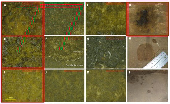Photographs of dark zones (H,L) from the Apse compared with a black stain (D), and Dino-Lite microscope photographs of dark zones (B,C,F,G) compared with outside parts near dark zones (J,K), as well as black stains (A,E) and outside parts near a black stain (I). The reference situation of Apse black stains is shown in red frames, (B). (F) (showing the limit of a dark zone) and (J) correspond to left wall photographs, and (C). (G) (showing F. candida collembola) and (K) to right wall photographs.