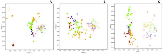 NMDS comparison of black stains (left wall samples in red and right wall samples in blue), dark zones (left wall samples in green and right wall samples in orange) and nearby unstained parts (empty symbols) from the left and right walls of Lascaux’s Apse taken in June–July 2015 (circles), January 2016 (squares), May–June 2016 (triangles) and December 2016 (diamonds), based on the relative proportion of both phyla and classes in the fungal (A), micro-eukaryotic (B) and bacterial communities (C). Data used for black stains and their neighboring unstained parts are those from Alonso et al. []. Stress values were 0.22, 0.19 and 0.17 for fungi, micro-eukaryotes and bacteria, respectively.