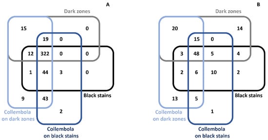 Venn diagrams showing unique and shared bacterial OTUs (A) and fungal OTUs (B) in collembola from dark zones, collembola from black stains, dark zones and black stains. Data used for black stains and black stain collembola are those from Alonso et al. [].