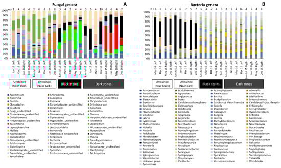 Community composition at genus level for fungi (A) and bacteria (B) in dark zones (Dark), black stains (Black) and nearby unstained parts (respectively Near Dark and Near Black) sampled from the left (L) and right (R) walls of Lascaux’s Apse in June–July 2015 (15J), January 2016 (16J), May–June 2016 (16M) and December 2016 (16D). Genera representing more than 1% of sequences are indicated. Each histogram is the average from 1–16 samples (indicated in each case). Data used for black stains and their neighboring unstained parts are those from Alonso et al. []. Detailed data are reported at Tables S1 and S2.