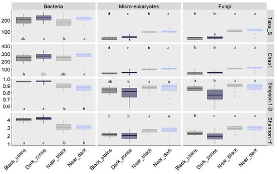 Number of taxa, Chao1 index of OTU richness, Simpson’s index of diversity and Shannon index of OTU diversity for bacteria, micro-eukaryotes and fungi in dark zones (Dark), black stains (Black) and nearby unstained parts (Near Dark and Near Black, respectively) sampled in Lascaux’s Apse walls. Data were combined for the left and right walls sampled in June–July 2015, January 2016, May–June 2016 and December 2016. The differences between conditions are shown with lowercase letters (based on ANOVA and Tukey’s tests; p < 0.05). Data used for black stains and their neighboring unstained parts are those from Alonso et al. [].