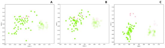 NMDS comparison of dark zones and nearby unstained parts from the walls of Lascaux’s Apse taken in June–July 2015, January 2016, May–June 2016, December 2016 and from the Nave in February 2017, based on the relative proportion of both phyla and classes in the fungal (A), micro-eukaryotic (B) and bacterial communities (C). Apse data for dark zones and their neighboring unstained parts are those already shown in Figure 2 for the same sampling dates. Stress values were 0.19, 0.19 and 0.15 for fungi, micro-eukaryotes and bacteria, respectively. Green circles represent Apse samples, pink circles Nave samples, and empty symbols unstained parts of the Apse and Nave.