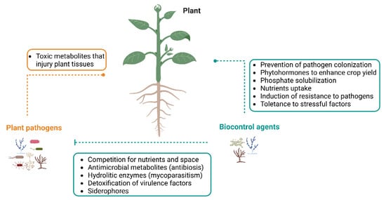 Overview of possible modes of action of endophytic fungi as biological control agents and plant-growth promoters. Beneficial microorganisms can exhibit direct antagonism against plant pathogens (inhibitor green line), as well as promote plant growth (dotted green line). Plant pathogens can also produce toxins to injure the plant (dot orange line). The figure was created with BioRender.com (accessed on 20 October 2022).