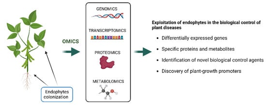 Schematic representation of omics approaches’ suitability for the exploitation of fungal endophytes for their application as biocontrol agents and plant-growth promoters. The figure was created with BioRender.com (accessed on 20 October 2022).