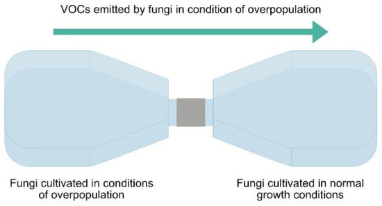 Experimental setup used to observe the effect of the fungal volatolome on fungal growth without physical contact.
