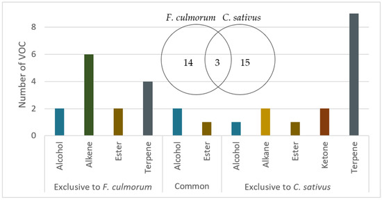 A total of 32 VOCs were identified for both species and growth conditions combined (Table 2). The comparison of VOCs emitted by the two species, all growth conditions considered, shows a common base of three VOCs (ethyl acetate, 3-methylbutan-1-ol, and 2-methylpropan-1-ol) (Figure 3). Differences in the chemical families of VOCs associated exclusively with one of the two species are notable. Indeed, a greater number of alkenes are emitted by F. culmorum whereas VOCs of the terpene family are predominantly emitted by C. sativus. In addition, ketones are only detected for the C. sativus species (Figure 3).