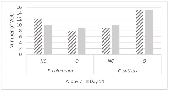 Number of VOCs emitted by F. culmorum and C. sativus after 7 and 14 days of culture in conditions of normal (NC) and overpopulation (O) growth.