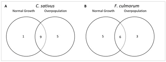 Among the 15 specific VOCs emitted by C. sativus, nine were commonly emitted under both growth conditions, five were emitted only under overpopulation conditions (propan-1-ol, ethyl 2-methylbutyrate, acetoin, butan-2-one, and unknown sesquiterpene 1), and one (α-gurjunene) was only emitted under normal growth conditions (Figure 5A). Concerning the 14 VOCs specific to F. culmorum, six were common to both growth conditions, five VOCs were only emitted in the case of normal fungal growth conditions (β-phellandrene, p-xylene, mesitylene, 2,6-dimethylanisole, and 2-phenylethanol), and three in conditions of overpopulation (pseudocumene, hemellitol, and pentan-1-ol) (Figure 5B).